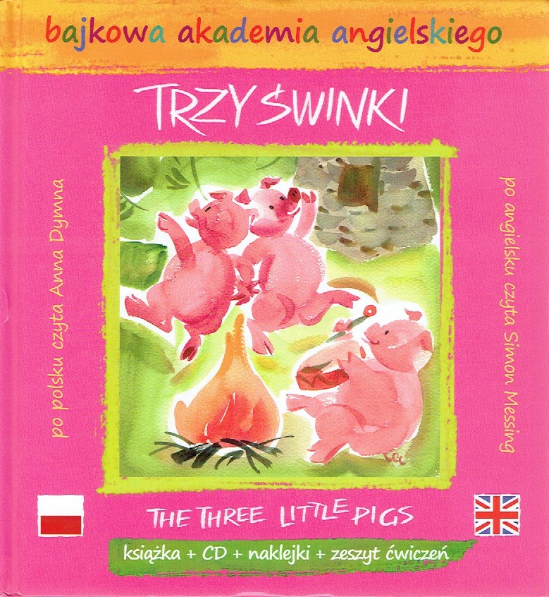 Trzy świnki =The three little pigs / Simon Messing ; tłumaczenie Ewa Palczak ; ilustracje Małgorzata Flis ; po polsku czyta Anna Dymna, po angielsku czyta Simon Messing. - Kraków : Axel Springer Polska, copyright 2009. - 42, [2] stron : ilustracje kolorowe; 22 cm + zeszyt ćwiczeń : 15 stron : ilustracje kolorowe ; 21 cm +1 dysk optyczny (CD).